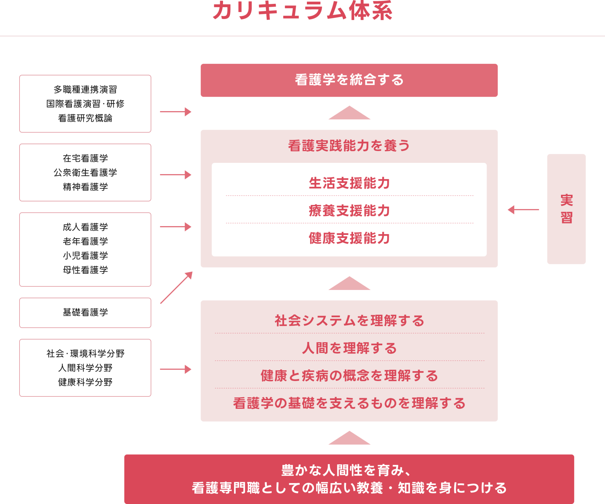 看護学科では、看護の専門知識を理解するための学びから、実践能力を高める科目の履修へとスムーズに移行できるよう、効果的な演習の機会を豊富に設けて体系化したカリキュラムを導入しています。並行して実施される、キャンパス内の医学部付属病院で行う実習では、看護の専門職としてのスキルを体得することができます。